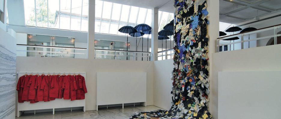 eine raumgreifende Installation aus Arbeitshandschuhen,